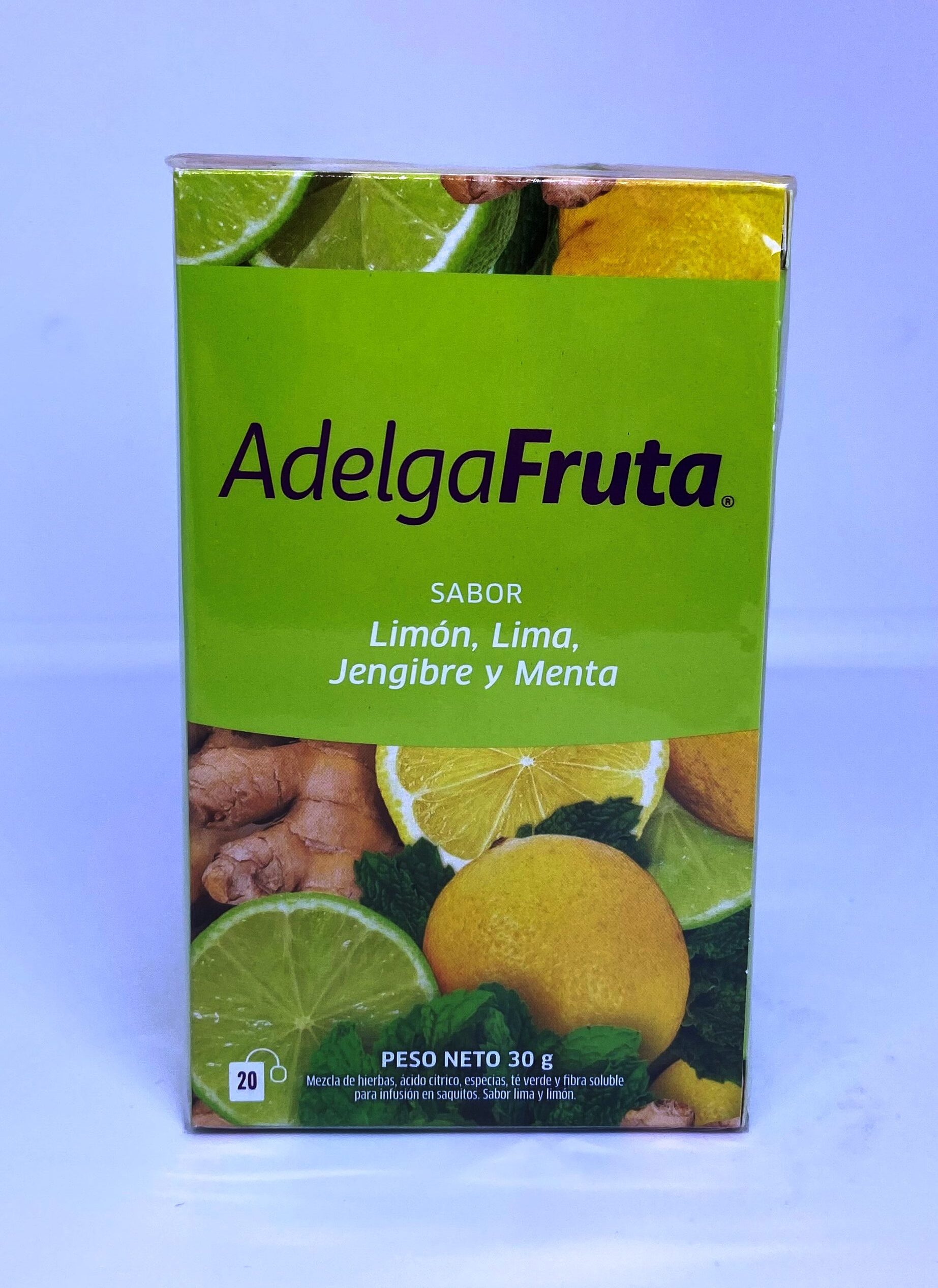 Ingredientes: Menta, cedrón, manzanilla, ácido cítrico, jengibre, té verde, sabor limón, sabor lima, cúrcuma, fibra soluble.